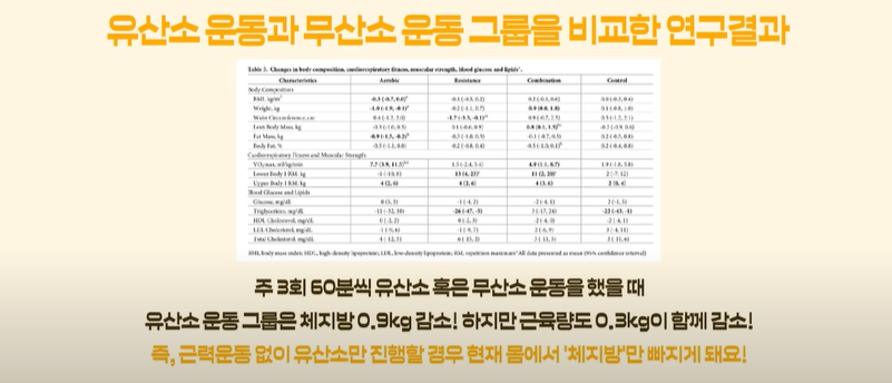 60분씩 주 3회 유산소 혹은 무산소 운동을 했을 때 유산소 운동 그룹은 체지방과 함께 근육량도 빠졌습니다