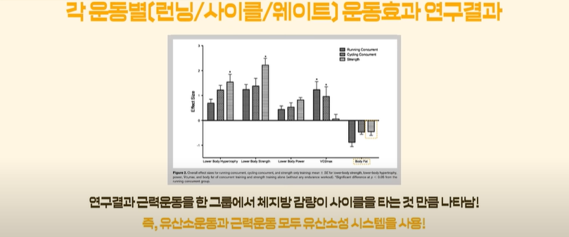 근력운동을 한 그룹에서 체지방 감량이 사이클을 타는 것 만큼 나타난 것을 확인할 수가 있습니다