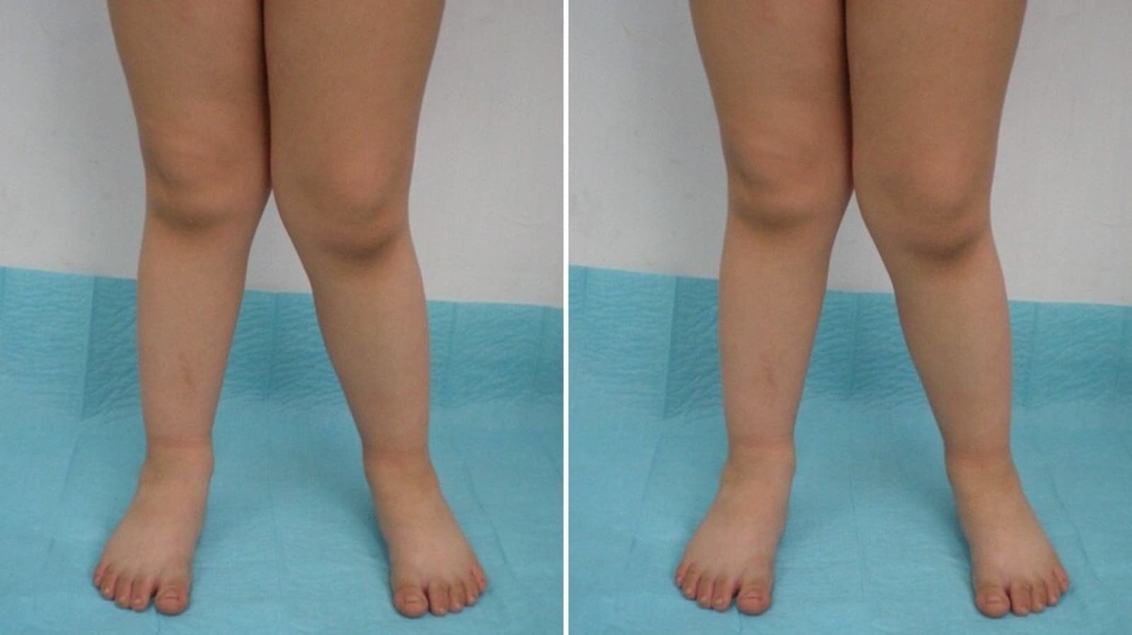 XO다리는 일반적으로 허벅지와 무릎, 발목은 서로 붙지만