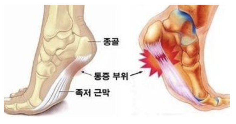 발가락 기저 부위에 붙은 얇지만 강한 섬에 띠를 족저근막이라고 합니다.